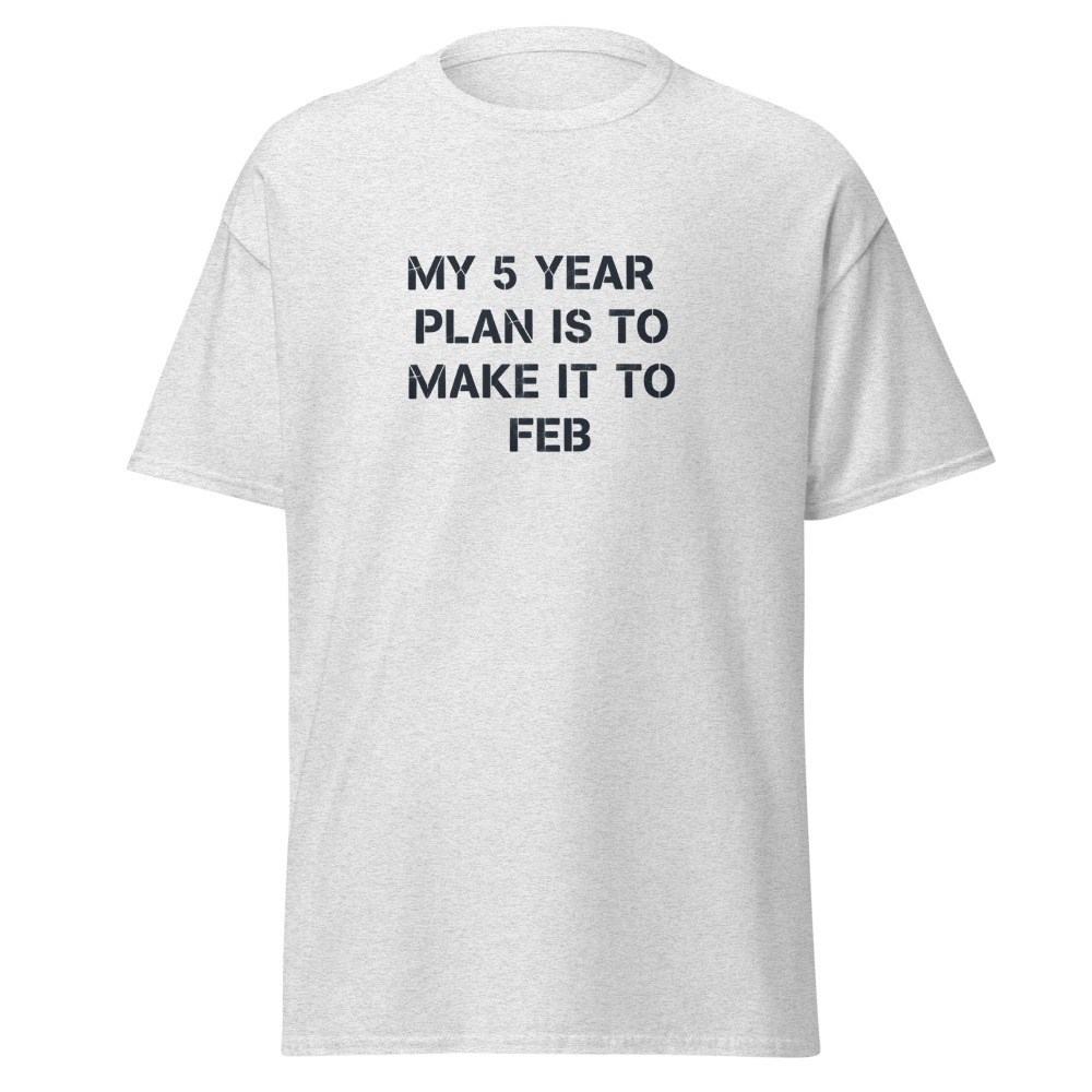 Embrace the humor of life with our 'My 5 Year Plan is to Make It to Feb' tee. Perfect for those who take life one month at a time!