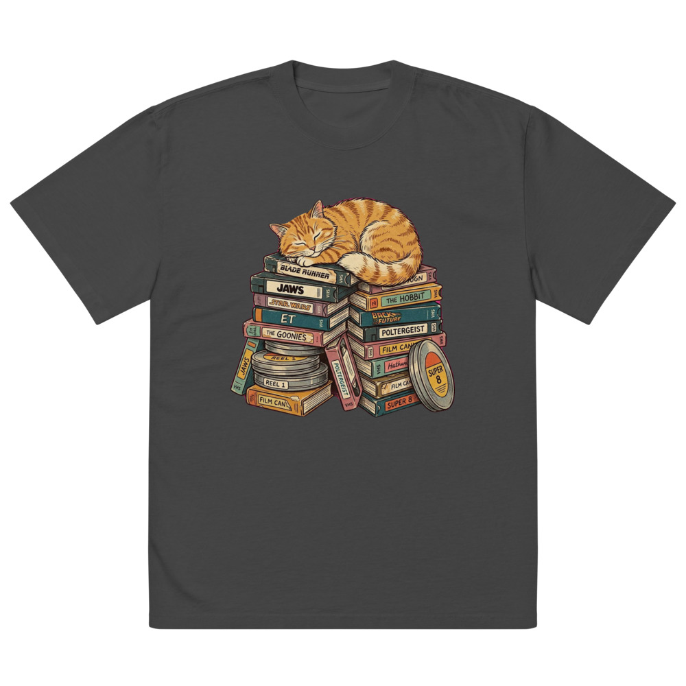 Cozy cat sleeping on a stack of VHS tapes for National Film Day. For cinephiles whose watchlist grows faster than they can watch.