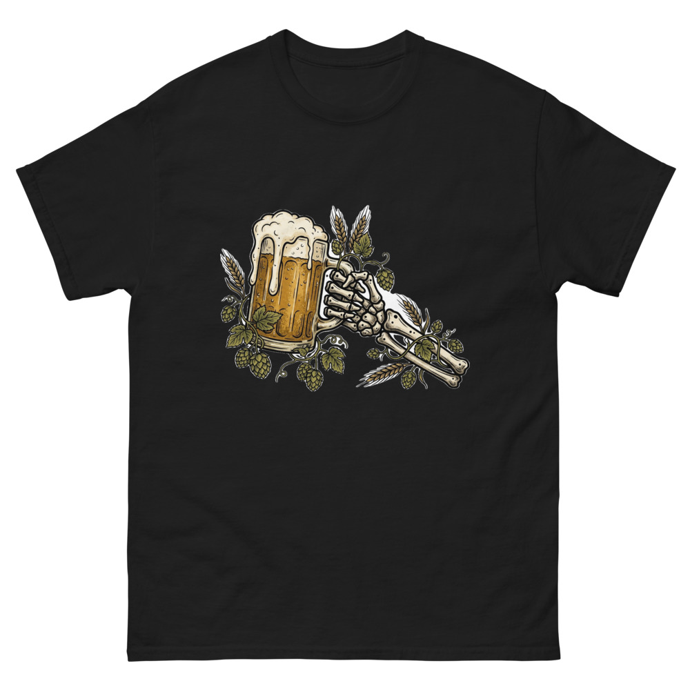 Skeleton Hops Cheers National Beer Day Vintage Tattoo. Graphic design on premium cotton for graphic tee enthusiasts.